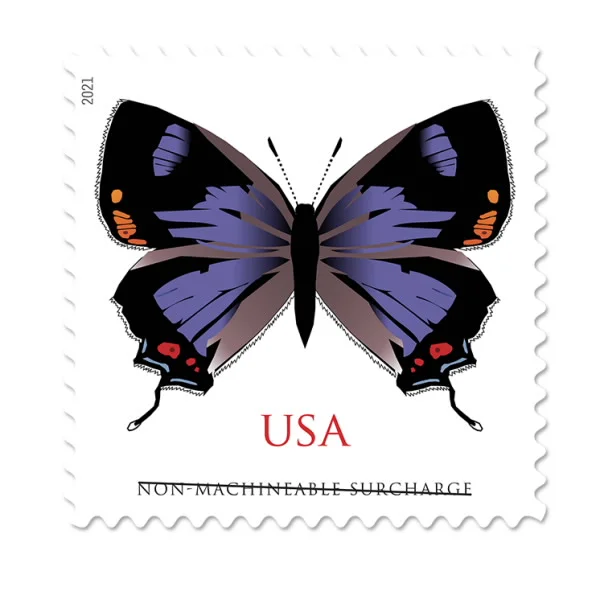Adult Colorado hairstreaks boast a wingspan of one to one and a half inches, featuring a thin tail on each back wing that gives the species its name. Their wings exhibit a dark purple hue with a wide black border and orange spots on the outer edges. The butterfly’s underside displays gray wings with white and black marks, accompanied by an orange patch or small spot.