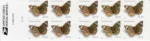 The Common Buckeye butterfly is found across much of the United States in the summer season. In autumn, hordes of butterflies along the East Coast migrate south. The eyespots on the wings serve to startle predatory birds. The Common Buckeye stamp was issued in three formats ??C with an 11 ? perf, with an 11 die cut perf, and in coil form.