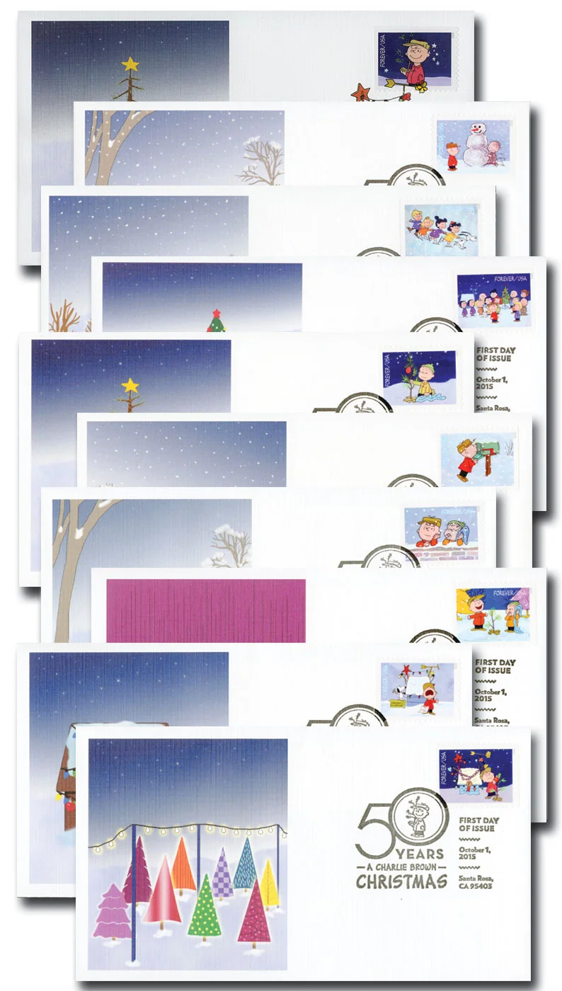 Each of the Charlie Brown Christmas Stamps features a still taken from?A Charlie Brown Christmas.??Art director Antonio Alcal?? designed the Stamps.