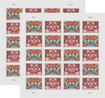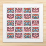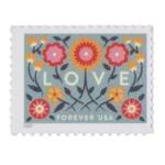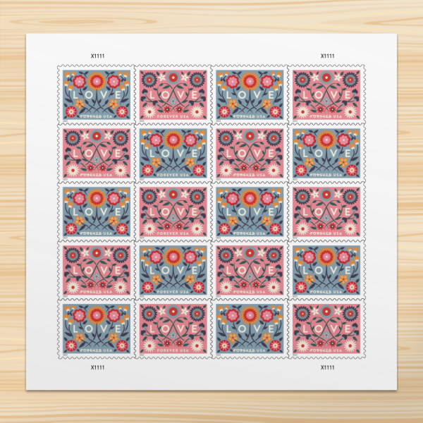 About the stamp design:??Pictures graphic illustrations of flowers inspired by European folk art.? Shows twisting vines, small flowers, and abstract heart shapes.? The stamp has a powder blue background.