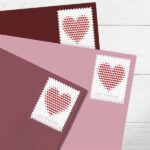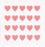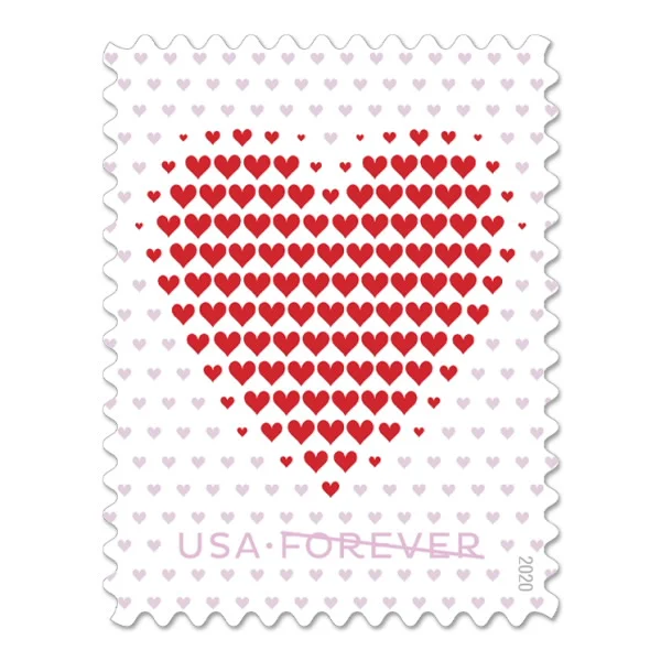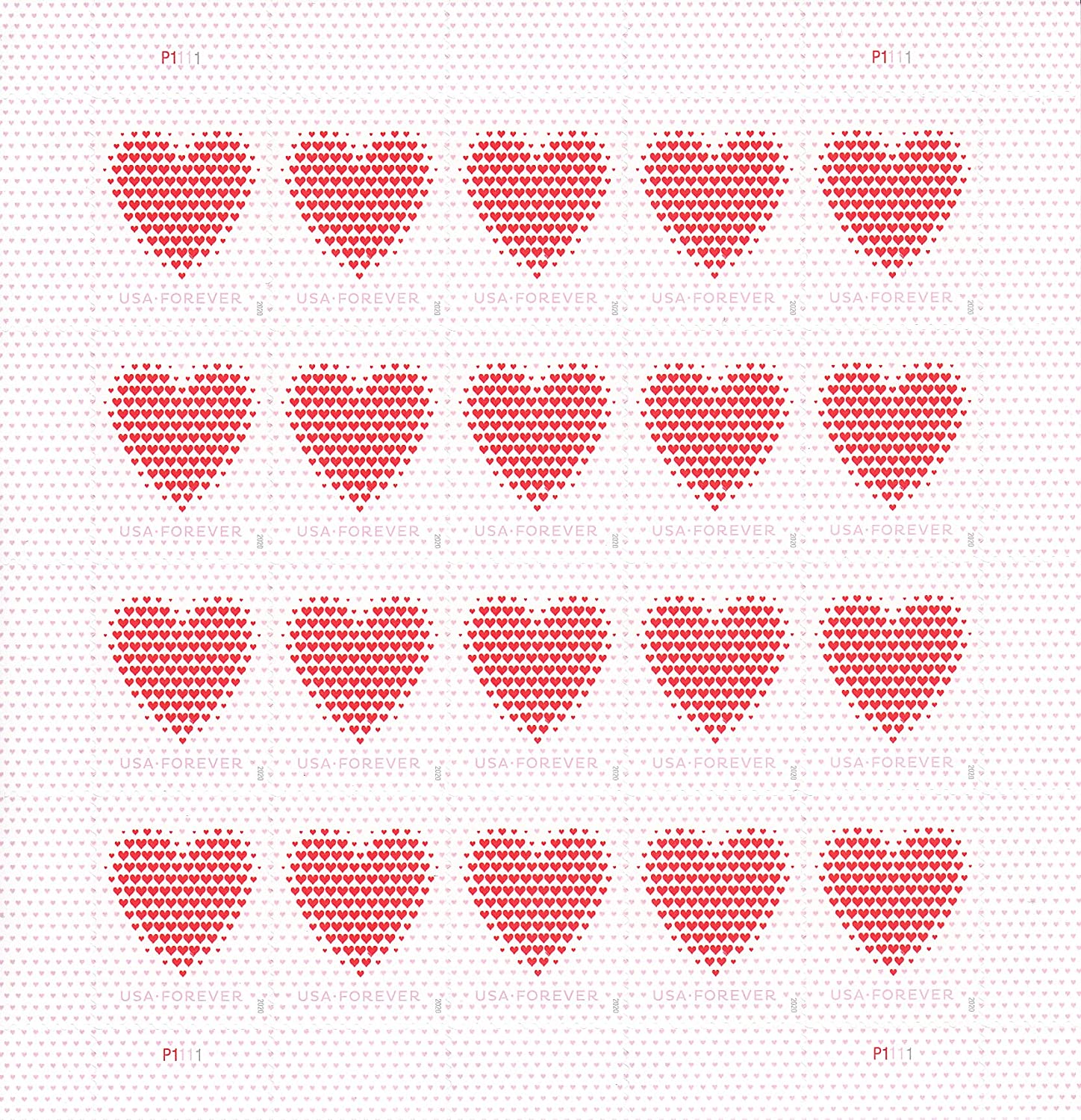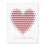 The stamp art features horizontal lines of red and pink hearts on a white background. Toward the center, red hearts in varying sizes replace pink hearts in a formation that creates one large red heart, the focal point of this graphic design.