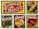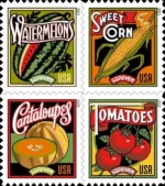 The U.S. Postal Service celebrates a few of those favorites-corn, tomatoes, cantaloupes, and watermelons-with four new Stamps. Vintage produce advertising, including 19th- and early 20th-century crate labels, seed packets, and catalogs, inspired these stamp designs.