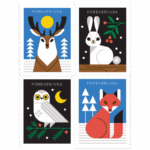 Each stamp actively features a different woodland animal – deer, fox, rabbit, and owl, in their wintery habitats. Katie Kirk illustrated the art.